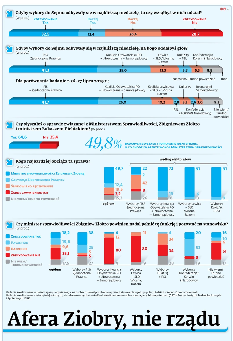 Nie widać też, by ta kwestia przekładała się na notowania ugrupowania rządzącego. Są one praktycznie identyczne jak przed miesiącem. Zdaniem Marcina Dumy z IBRiS to efekt m.in. wakacji – Polacy mniej żyją polityką. Z badań sondażowni wynika, że w porównaniu z kampanią do wyborów europejskich liczba osób śledzących na bieżąco wydarzenia polityczne znacząco spadła. Być może też sprawa w resorcie sprawiedliwości dla sporej części społeczeństwa okazała się zbyt hermetyczna. Choć jest głośna i gorąco dyskutowana w mediach, to wielu wyborcom może się wydawać, że dotyczy części elit, a nie ich bezpośrednio. To nie znaczy, że jej skutki nie dotkną PiS. – To rzeczy, które odkładają się i nie działają od razu – podkreśla politolog Anna Materska-Sosnowska. Jej zdaniem sondaż pokazuje jednak, że sprawa dotarła do dużej grupy wyborców – wynika z niego, że blisko połowa nie tylko słyszała o całej sprawie, ale także rozumie, o co chodzi. Jakie w takim razie powinny być dalsze losy Zbigniewa Ziobry? Według niemal 45 proc. ankietowanych nie powinien już pełnić swojej funkcji. Niewiele mniej, 38 proc., jest zdania, że minister powinien pozostać na stanowisku. – W dymisję ministra Ziobry nie wierzę.