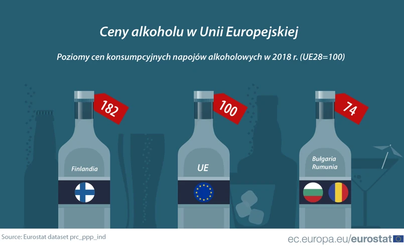 Gdy porównamy poziomy cen liczone w parytecie siły nabywczej w poszczególnych krajach ze wskaźnikiem średniego poziomu cen w UE wynoszącym 100, to wyniki pokazują, że wśród państw członkowskich UE w 2018 r. cena napojów alkoholowych (wódki, wina i piwa) była najwyższa w Finlandii. Na dalekiej północy wskaźnik poziomu cen wynosił 182, czyli o 82 proc więcej niż wynosi średnia cena w UE. Kolejne państwa, gdzie za alkohol trzeba słono płacić, to Irlandia (177) i Szwecja (152). Natomiast za alkohol płaci się najwięcej w skandynawskich krajach, które do UE nie należą. Na Islandii wskaźnik w 2018 r. wynosił prawie 268, a w Norwegii 252.