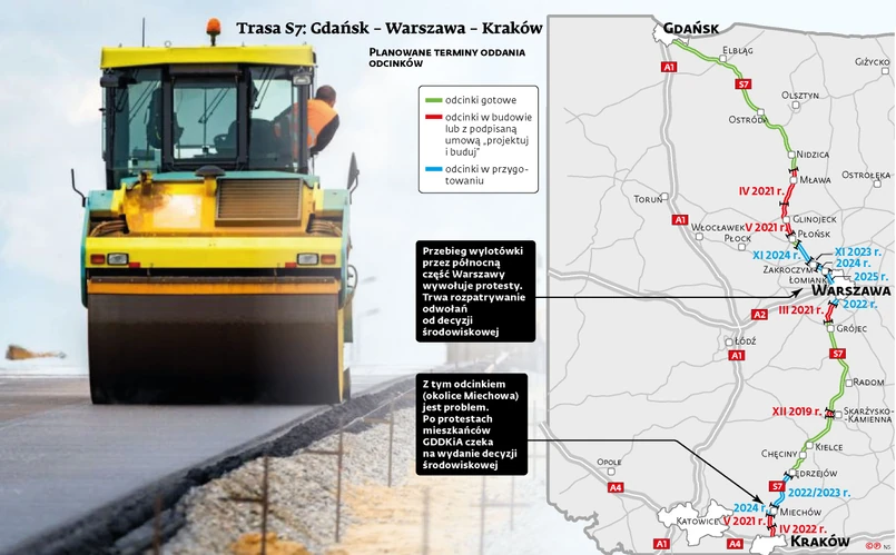 Wczoraj zaczęły się roboty na pierwszym odcinku na północ od Krakowa. Chodzi o 14-km fragment Szczepanowice – Widoma, który m.in. ominie Słomniki. Za 508 mln zł zbuduje go firma Mota Engil Central Europe. Według umowy ma być gotowy w maju 2021 r. Na ukończenie całej trasy S7 w Małopolsce trzeba będzie jednak poczekać przynajmniej pięć lat. Problem będzie np. z odcinkiem najbliżej Krakowa, który zgodnie z umową do kwietnia 2022 r. ma zbudować firma Salini. W zakładanym terminie, czyli do 26 lipca, nie udało się jej złożyć wniosku o wydanie decyzji ZRID (na realizację prac budowlanych). Firma tłumaczy to m.in. kolizjami z terenami PKP. Według Jana Krynickiego, rzecznika Generalnej Dyrekcji Dróg Krajowych i Autostrad, trwa analiza zasadności argumentów wysuwanych przez wykonawcę. Drogowcy na razie nie przewidują zmiany terminu zakończenia prac. W Małopolsce kłopot będzie też koło Miechowa. Kilka lat temu przebieg drogi oprotestowali okoliczni mieszkańcy. GDDKiA czeka teraz na wydanie nowej decyzji środowiskowej. Drogowcy liczą, że ten odcinek będzie ukończony w 2024 r.