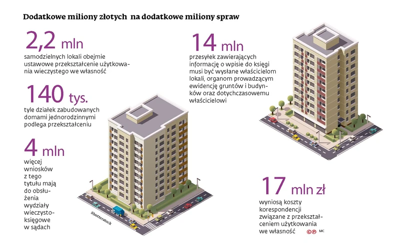 Według danych Ministerstwa Sprawiedliwości liczba wszystkich samodzielnych lokali, z którymi związany jest udział w użytkowaniu wieczystym gruntu, wynosi 2 225 423. Jednak z uwagi na to, że udział w nieruchomości wspólnej ujawniany jest w dwóch księgach wieczystych, tj. w tej prowadzonej dla nieruchomości, z której wyodrębniono lokal mieszkalny (tzw. księdze macierzystej), jak również w tej prowadzonej dla lokalu, do sądów wpłynie ponad 4 mln wniosków. Do tego trzeba doliczyć wpisy dotyczące gruntów zabudowanych domami jednorodzinnymi, których jest ok. 140 tys. Nic dziwnego więc, że opóźnienia, szczególnie w sądach wielkomiejskich – rosną.