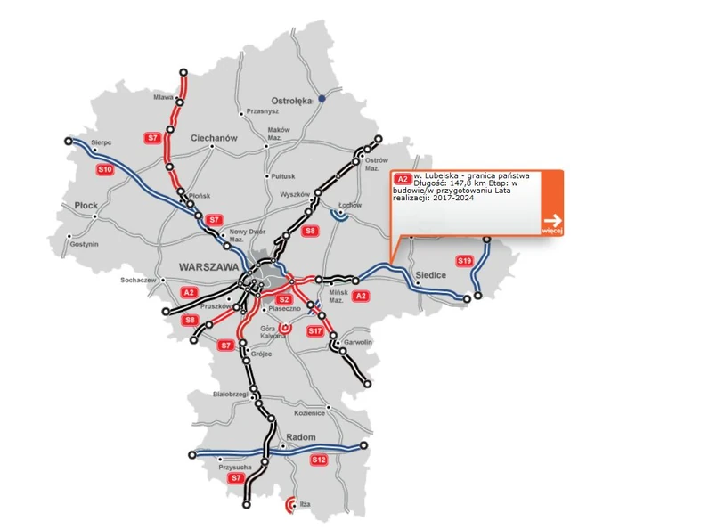 GDDKiA przypomina, że na A2 na wschód od Warszawy w realizacji są odcinki: