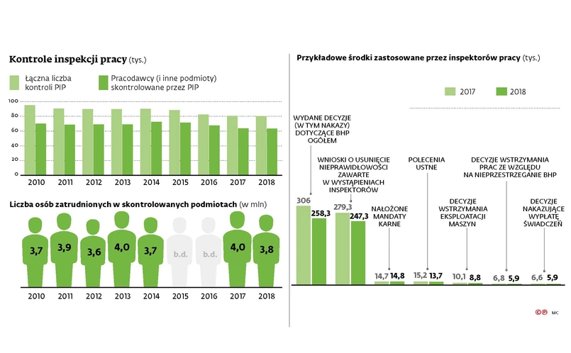 W ubiegłym roku inspektorzy pracy przeprowadzili 80,2 tys. kontroli u 63,3 tys. pracodawców (lub innych podmiotów), którzy zatrudniali łącznie 3,7 mln osób. W porównaniu do 2017 r. liczby te zmniejszyły się nieznacznie, ale jeśli zestawi się je z danymi za 2014 r., to okaże się, że w ciągu czterech lat liczba wizytacji zmniejszyła się o prawie 10 tys. (11 proc.), a ilość skontrolowanych firm o 9,4 tys. (12,9 proc.). Te, które naruszają prawo pracy, mają więc większe szanse na to, że nieprawidłowości ujdą im na sucho. Tym bardziej że inspekcji dodaje się nowe zadania, które skupiają uwagę inspektorów kosztem tradycyjnych celów nadzoru (bhp, czas pracy, wynagrodzenia). Przykładem może być wprowadzony w ubiegłym roku zakaz handlu w niedziele. W 2018 r. inspektorzy wydali wyraźnie mniej decyzji nakazujących np. usunięcie naruszeń bhp (w tym wstrzymania prac ze względu na zagrożenie życia lub zdrowia pracowników), bo musieli sprawdzać, czy właściciele sklepów nie otwierają ich w niedziele.