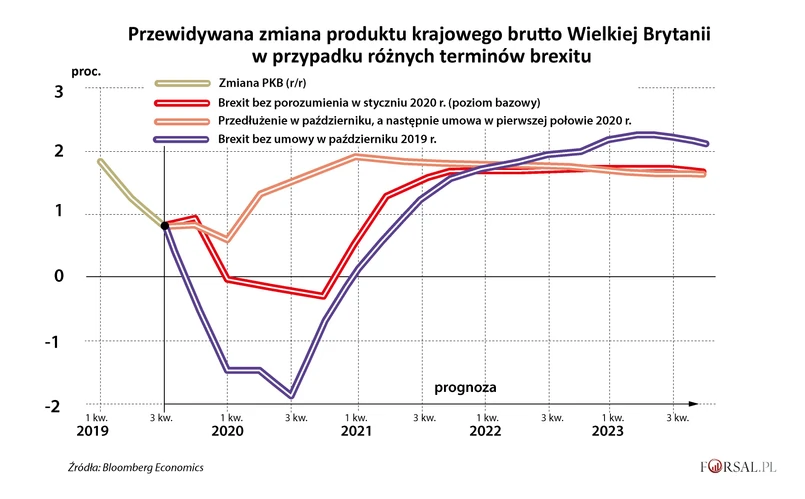 Ekonomiści przewidują, że brytyjska gospodarka dotkliwie odczuje rozwód z Unią Europejską. Wraz z wyjściem z UE nadejdzie recesja, inflacja powyżej celu i obniżki stóp procentowych przez Bank Anglii. Wykres powyżej pokazuje, jak może zmieniać się PKB Wielkiej Brytanii w zależności od wariantu i terminu brexitu.