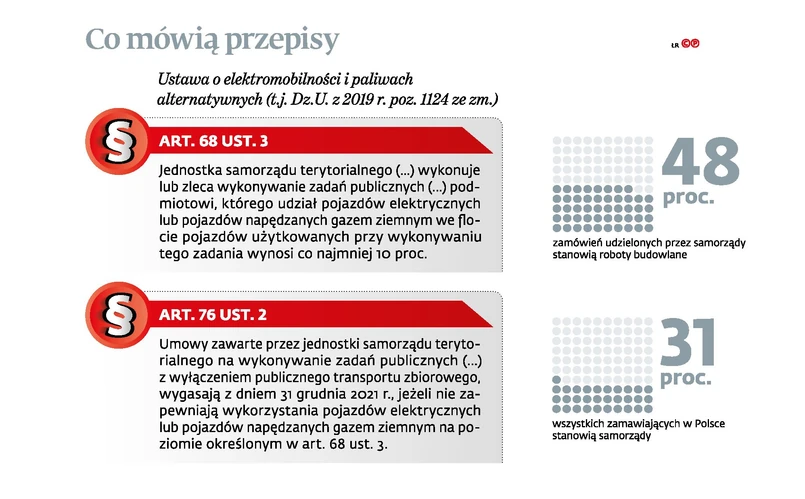 Resort energii, do którego również przesłaliśmy pytania, pozostawił je bez odpowiedzi. Tymczasem sprawa jest nie tylko poważna, ale i pilna, gdyż w tej chwili przygotowywane są specyfikacje przetargowe na roboty, które będą kończone po 2022 r. Co więcej, zgodnie z art. 76 ust. 2 ustawy (patrz: infografika) umowy zawarte przez jednostki samorządu terytorialnego na wykonywanie zadań publicznych wygasną automatycznie z końcem 2021 r., jeśli nie zapewnią wykorzystywania pojazdów elektrycznych lub na gaz na poziomie 10 proc. To spore zagrożenie dla kontraktów, które nie zakończą się w 2021 r. Firmy nie mogłyby ich bowiem kontynuować, używając wyłącznie samochodów na benzynę czy olej napędowy.