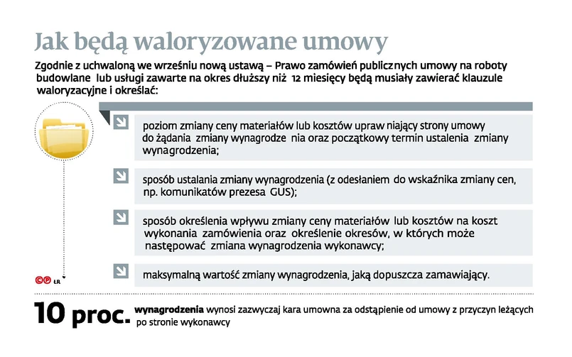 Remedium na kłopoty wykonawców wynikające z nieprzewidzianych wzrostów cen ma być obowiązek wpisywania klauzul waloryzacyjnych do umów trwających dłużej niż 12 miesięcy (patrz ramka). Przewiduje to uchwalona niedawno nowa ustawa p.z.p. Wejdzie ona jednak w życie dopiero w 2021 r.