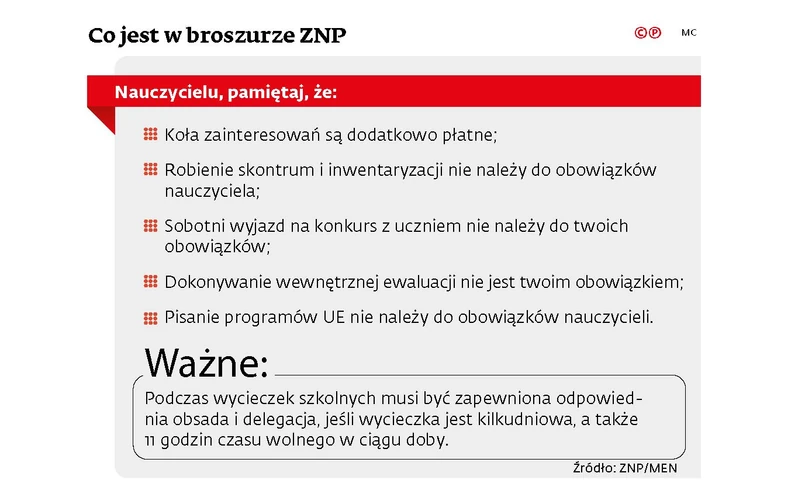 – W przypadku gdy wymienione przez ZNP zadania, jak np. udział w kilkudniowych wycieczkach, przypadają poza wyznaczonymi godzinami pracy, nauczyciel powinien otrzymać wynagrodzenia za nadgodziny lub dzień wolny w innym terminie – wyjaśnia dr Pogłódek.