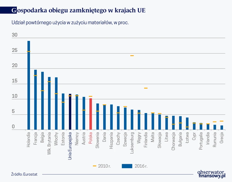 Z sięganiem w produkcji po to, co było już przynajmniej raz użyte, najlepiej wśród krajów UE radę daje sobie Holandia. Tam stopa powtórnego użycia sięgała w 2016 r. aż 29 proc. W 2010 r. była ona o ponad 3 pkt proc. niższa.