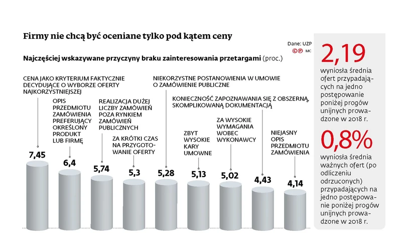 Problem jest znany od lat. Już raport Komisji Europejskiej za lata 2006–2010 pokazywał, że byliśmy na trzecim od końca miejscu w UE, jeśli chodzi o konkurencyjność. Kolejne rządy próbowały zachęcić przedsiębiorców do udziału w przetargach, ale nie przynosiło to efektów. Teraz jest szansa na zmianę. Urząd Zamówień Publicznych przeprowadził kompleksowe badanie wśród przedsiębiorców i przeanalizował przyczyny zniechęcające ich od startu w przetargach.