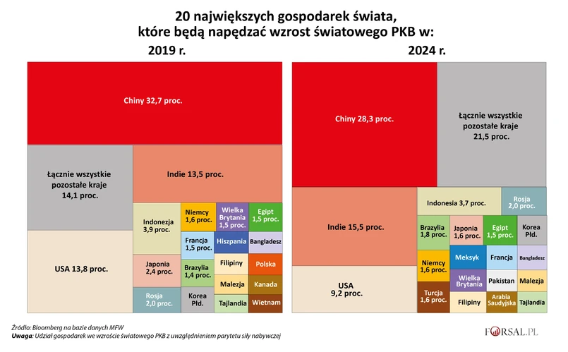 Na bazie skorygowanych o parytet siły nabywczej prognoz MFW, Bloomberg spróbował odpowiedzieć na pytanie, które gospodarki są teraz głównymi graczami na świecie i kto będzie napędzał globalny wzrost za pięć lat.