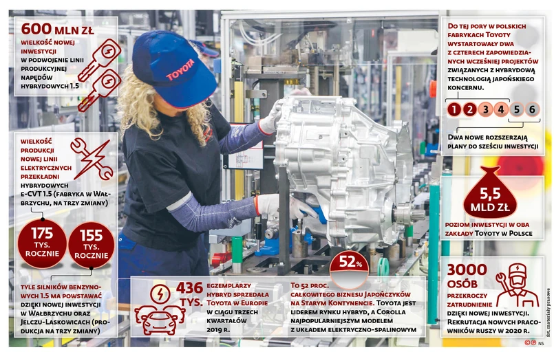 Do tej pory w polskich fabrykach Toyoty wystartowały dwa z czterech zapowiedzianych wcześniej projektów związanych z hybrydową technologią. Jesienią 2018 r. w Wałbrzychu uruchomiono produkcję elektrycznych przekładni hybrydowych 1.8 (278 mln zł inwestycji). Na początku września 2019 r. w Jelczu-Laskowicach nakładem 370 mln zł wystartowała produkcja najnowszej generacji silnika benzynowego 2.0 Dynamic Force, zaprojektowanego w ramach globalnej platformy Toyoty TNGA (Toyota New Global Architecture) i współpracującego z napędami hybrydowymi. Z planu japońskiej firmy wynika, że w kwietniu przyszłego roku kosztem 400 mln zł w Jelczu-Laskowicach ruszy produkcja pierwszej z dwóch planowanych linii silnika TNGA o pojemności 1,5 l. Na wiosnę 2021 r. w fabryce w Wałbrzychu przewidziano uruchomienie pierwszej z dwóch linii produkcyjnych współpracującej z nim elektrycznej przekładni hybrydowej, w tym produkcji silników elektrycznych, stanowiących integralną część elektrycznej przekładni hybrydowej (inwestycja na 300 mln zł).