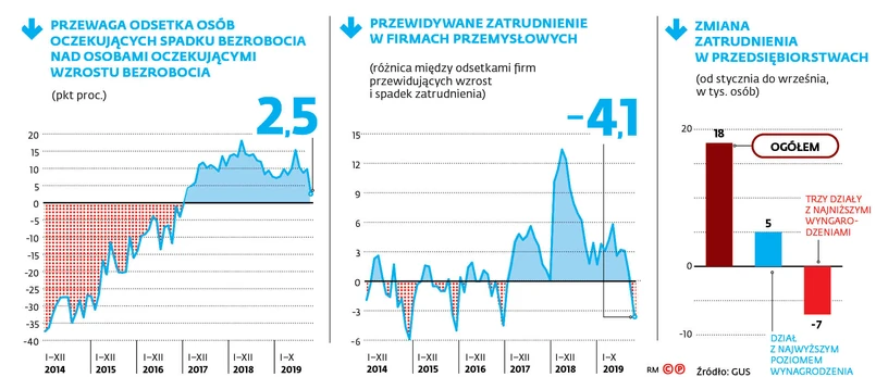 Z badań koniunktury w firmach przemysłowych wynika, że we wrześniu, pierwszy raz od stycznia 2017 r., większość przedsiębiorców zaczęła przewidywać ograniczanie zatrudnienia. W październiku to zjawisko się nasiliło. Teraz przewaga firm planujących cięcia kadrowe wynosi ponad 4 pkt proc. To samo widać w transporcie – tu przewaga firm, które planują zwolnienia, to mniej niż punkt procentowy. Równocześnie to jednak najgorszy wynik od 2014 r. W handlu detalicznym odsetek firm oczekujących ograniczenia zatrudnienia jest największy od 2016 r., a w handlu hurtowym od 2017 r.