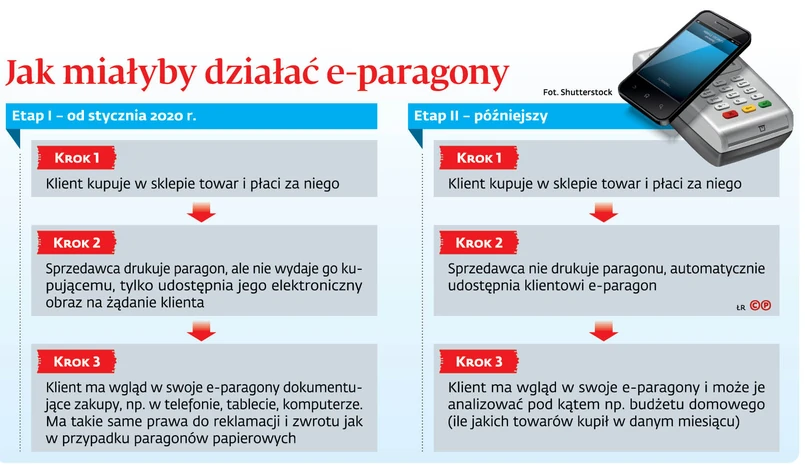 Jak może to wyglądać w praktyce? E-paragon w pierwszym etapie będzie udostępniany klientowi tylko na jego życzenie. Jeśli kupujący nie będzie go chciał, dostanie dokument papierowy. Projekt, nad którym pracuje resort finansów, pozostawia też dowolność w zakresie tego, jak e-paragon zostanie dostarczony do konsumenta.