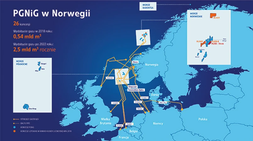 Na Norweskim Szelfie Kontynentalnym spółka PGNiG Upstream Norway posiada obecnie udziały w 26 koncesjach poszukiwawczych i wydobywczych. Koncesje przyznawane są co roku przez rząd norweski w ramach tzw. rund koncesyjnych. Udziały w koncesjach nabywane są także w drodze przejęć.