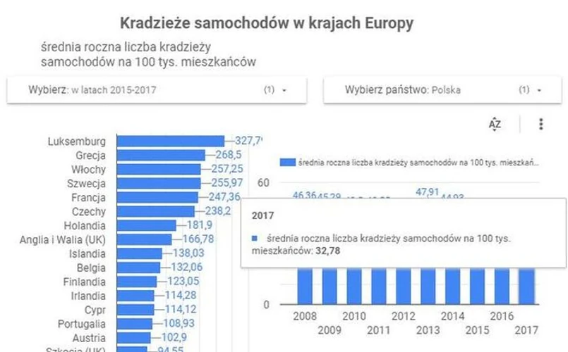 W Polsce w latach 2015-2017 średnio w roku kradziono 37 pojazdów na 100 tys. mieszkańców. To jest ósmy najniższy wynik wśród państw Wspólnoty. W porównaniu z okresem 2008-2010, oznacza to spadek o 18 proc. W trzyletnim okresie (2015-2017) w Polsce kradziono nieco ponad 14 tys. pojazdów rocznie.