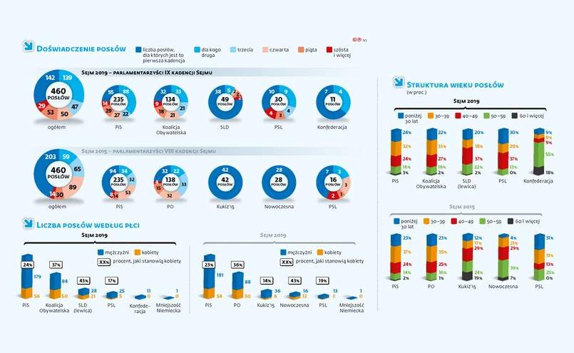 Porównując Sejmy VIII i IX kadencji pod kątem wieku, można powiedzieć, że aktualny Sejm nieco nam się odmłodził. W 2015 r. było 250 posłów (ponad 54 proc.) w wieku 50 lat i więcej. W tym roku jest ich 244 (53 proc.). Proporcjonalnie najstarszym klubem jest Koalicja Obywatelska, gdzie 33 proc. działaczy (44 osoby) jest w wieku 50–59 lat. W PiS w takim wieku jest 32 proc. posłów (76 osób). Stosunkowo najmłodszych działaczy ma Konfederacja – 55 proc. posłów (sześć osób) jest w wieku 30–39 lat. Z kolei politycy Lewicy i PSL najczęściej mają od 40 do 49 lat.