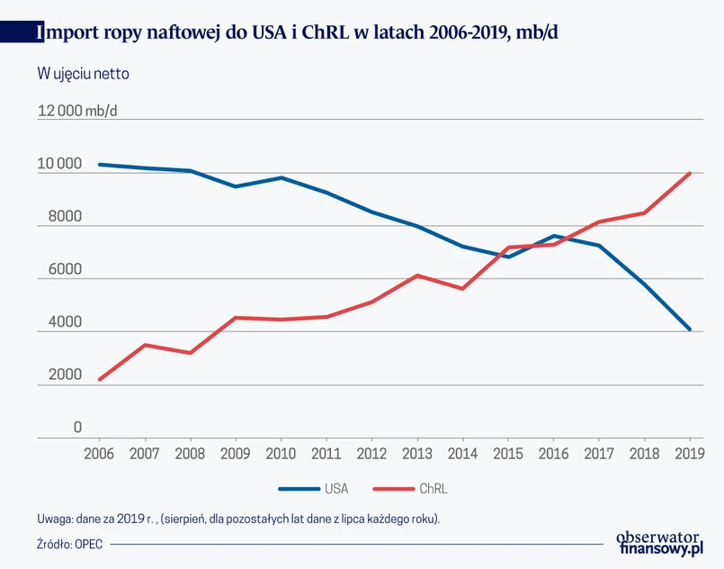 Chcąc jednak zobaczyć, jak na przestrzeni ostatnich lat przejawiał się brak takiej współpracy, wystarczy przyjrzeć się szlakom geograficznym, które wytyczają napływ wydobywanej ropy naftowej. Trudno znaleźć lepszy okres na dokonanie takiej analizy niż ostatnie 13 lat. Przede wszystkim w oczy rzuca się zmiana lidera wśród największych importerów ropy naftowej. Nie są to już USA. Oddały palmę pierwszeństwa Chinom.