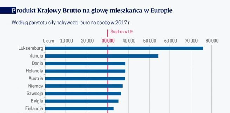 W Polsce – jak wynika z danych Eurostatu – międzyregionalne różnice w PKB na głowę mieszkańca są jeszcze większe. W najbiedniejszym pod tym względem województwie lubelskim PKB na głowę (według parytetu siły nabywczej) wynosił w 2017 r. 14,4 tys. euro. W najbogatszym województwie mazowieckim – 33,5 tys. euro. To o 133 proc. więcej. Województwo mazowieckie samo jest jednak ogromnie zróżnicowane, dlatego wskazując międzyregionalne dysproporcje w naszym kraju lepiej mówić oddzielnie o Mazowszu (bez Warszawy) i osobno o Warszawie, gdzie PKB na głowę wynosiło w 2017 r. 45,7 tys. euro, ponad trzykrotnie więcej niż w województwie lubelskim.