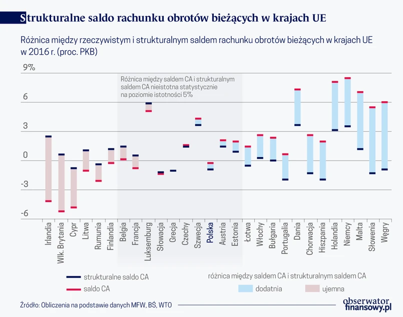 Po pierwsze, przez większość pierwszej dekady XXI w. w Polsce, podobnie jak w Czechach i na Słowacji, deficyt CA nieznacznie przewyższał deficyt strukturalny, zaś od 2011 r. saldo CA zbiegało w kierunku poziomu strukturalnego. Kryzys zapoczątkowany w 2008 r. wymusił proces dostosowawczy salda CA w kierunku strukturalnego salda CA w Grecji, Hiszpanii i Portugalii. Wzrost salda CA w tych krajach był bardziej rozłożony w czasie niż w Bułgarii oraz krajach bałtyckich. Z drugiej strony, obserwowane w Niemczech i Holandii nadwyżki CA nadal utrzymują się powyżej poziomów strukturalnych. W szczególności, w Niemczech saldo CA przekształciło się z oscylującego wokół poziomu strukturalnego deficytu rzędu 1 proc. w połowie lat 90. XX w. w nadwyżkę w 2002 r., która od tego roku systematycznie przewyższała poziom strukturalny. Ogólnie, w 2016 r. liczba krajów UE, w których saldo CA było wyższe od poziomu strukturalnego, była wyższa od liczby państw, w których saldo CA było niższe od poziomu strukturalnego.