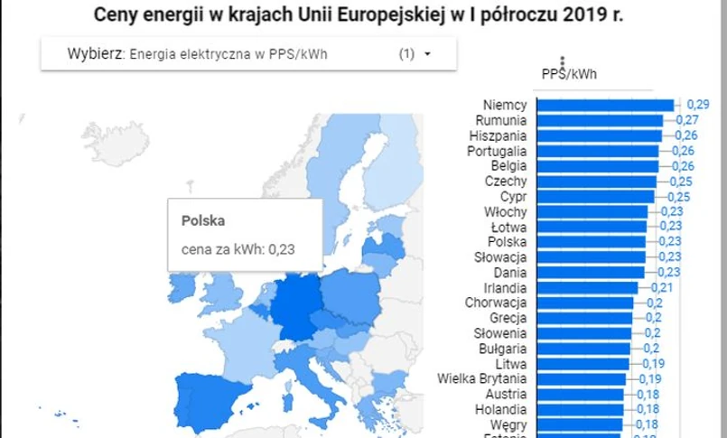 Z danych Eurostatu wynika, że w Polsce w tym okresie cena prądu dla gospodarstw domowych wynosiła 13,4 euro za 100 kWh. Cena na tym poziomie oznacza, że koszty energii elektrycznej dla polskich gospodarstw domowych są jednymi z niższych w Europie. Średnia dla UE to 21,6 euro za 100 kWh, a prąd tańszy od nas w przeliczeniu na euro mają tylko Bułgarzy, Węgrzy i Litwini. Sytuacja zmienia się diametralnie, gdy w porównaniu uwzględnimy siłę nabywczą naszych portfeli. Wtedy cena energii elektrycznej wyrażona w PPS (Purchasing Power Standard) wynosi 22,97 za 100 kWh, co oznacza, że w Polska plasuje się na 10. miejscu wśród państw z najdroższym prądem.