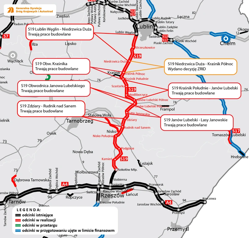 Łącznie w realizacji, w trybie „projektuj i buduj”, jest blisko 130 km drogi ekspresowej S19 - przyszłej Via Carpatia - pomiędzy Lublinem i Sokołowem Małopolskim. Budowę podzielono na 12 odcinków, po sześć w województwie lubelskim i podkarpackim. Z pierwszych odcinków kierowcy powinni skorzystać w połowie 2021 r., a z całej trasy w połowie 2022 r.