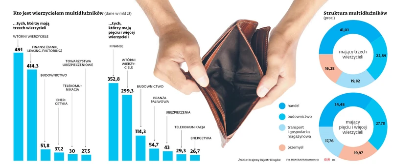 Według danych KRD najwięksi multidłużnicy działają w handlu. Ci z trzema wierzycielami są winni w sumie 314 mln zł. Handel odpowiada aż za 40 proc. takich długów. Może to się wydawać dziwne w dobie rosnącej konsumpcji prywatnej, która dla handlowców powinna być czasem żniw, ale informacje z rejestru są zbieżne z raportami innych biur informacji gospodarczej, a także firm zajmujących się ubezpieczaniem należności. Handel pod względem moralności płatniczej cienko przędzie, a przyczyną jest wyniszczająca konkurencja na marże, która uderza w małe i średnie sklepy i – pośrednio – w hurtownie, z którymi te sklepy nie rozliczają się na czas.
