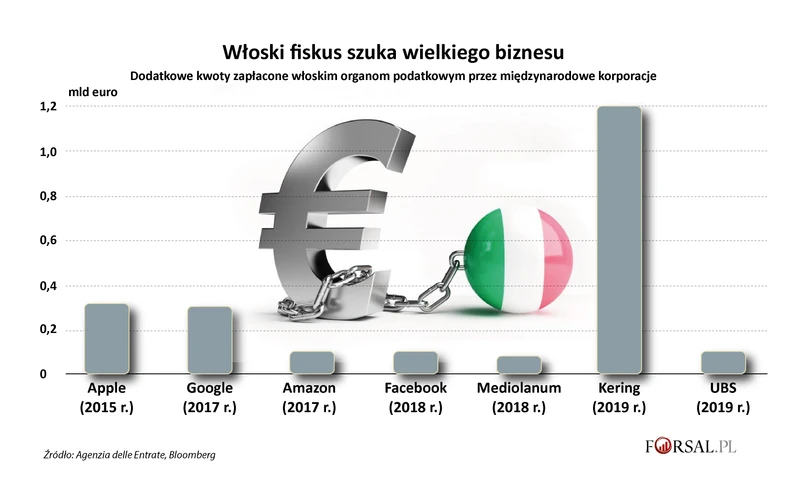 W ciągu ostatnich czterech lat Włochy zebrały 2,3 mld euro (2,6 mld dolarów) w rozliczeniach od firm, takich jak giganci technologiczni Google, Amazon, Facebook i Kering SA, właściciel luksusowej marki Gucci.