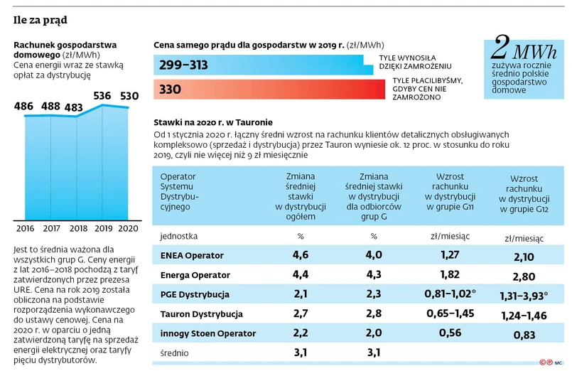 Od 1 stycznia rachunki klientów detalicznych obsługiwanych przez Tauron wzrosną średnio o ok. 12 proc. w stosunku do 2019 r., czyli jak tłumaczy urząd – nie więcej niż o 9 zł miesięcznie. PGE, Enea, Energa będą musiały rozliczać się z klientami na podstawie ostatnio zatwierdzonej stawki przez szefa URE, czyli taryfy na 2018 r. A to dlatego, że na 2019 r. nie było taryfy ze względu na ustawowe zamrożenie cen prądu. Jak podkreśla URE, dla tych firm zmiany w rozliczeniach z klientami od 1 stycznia 2020 r. mogą wynikać jedynie ze zmiany taryfy dystrybutora prądu, która wzrośnie średnio z 56 gr do 1,82 zł miesięcznie.