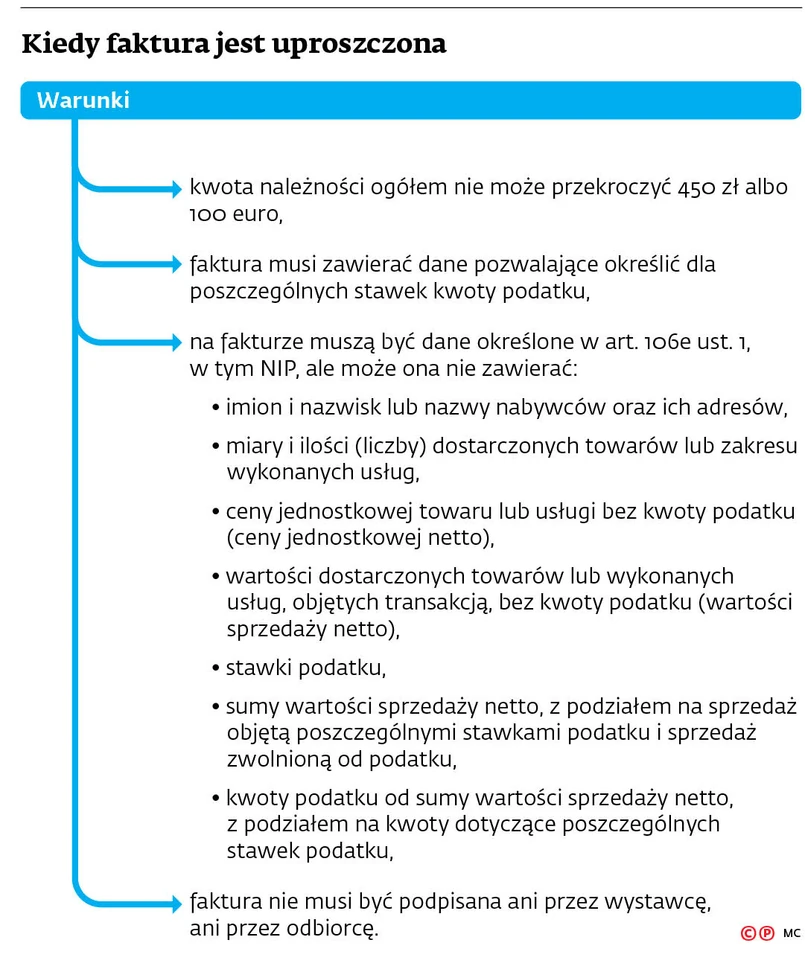 Już dziś sprzedawcy mogą wystawiać faktury uproszczone, gdy kwota należności ogółem nie przekracza 450 zł albo 100 euro (art. 106e ust. 5 pkt 3 ustawy o VAT). Nie trzeba wówczas podawać niektórych danych, które muszą zawierać zwykłe faktury (patrz ramka obok).