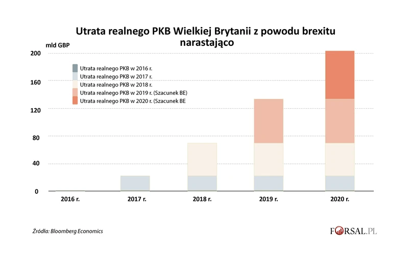 Z wyliczeń Bloomberg Economics wynika, że w tym roku koszt brexitu zwiększy się o kolejne 70 miliardów funtów, które nie trafią do PKB, co od referendum w 2016 r. łącznie daje kwotę ponad 200 mld funtów (około 260 mld dolarów).