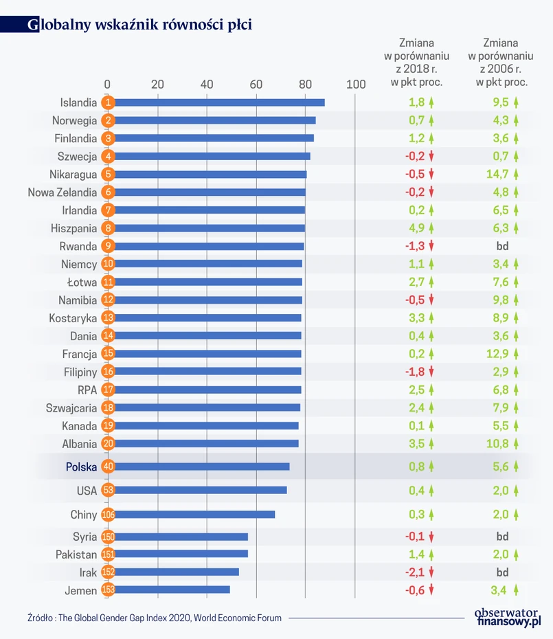 Jeśli oceniać sytuację w dłuższej perspektywie w okresie ostatnich 14 lat, od 2006 r. kiedy powstała pierwsza edycja rankingu WEF, do najnowszego jego wydania datowanego na rok 2020, pozycja kobiet najsilniej wzmocniła się w Nikaragui (wzrost wskaźnika o 14,7 pkt proc.), w Nepalu (wzrost o 13,2 pkt proc.), we Francji (wzrost o 12,9 pkt proc.) i w Etiopii (wzrost o 11,1 pkt proc.). Jedynym krajem w świecie, w którym sytuacja kobiet pogorszyła się od 2006 r. jest Gambia.