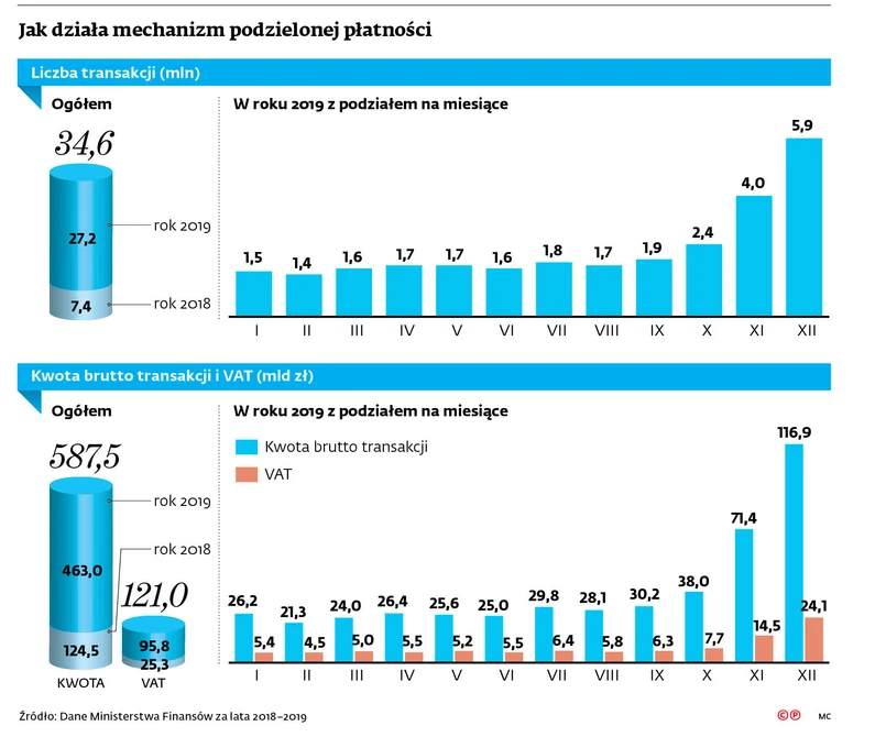 Dane MF pokazują, że systematycznie rośnie kwota VAT płaconego w ramach podzielonej płatności. Przez półtora roku, tj. od momentu wprowadzenia mechanizmu podzielonej płatności (co nastąpiło 1 lipca 2018 r.) do końca 2019 r., zrealizowanych zostało w ten sposób ponad 34,5 mln transakcji o łącznej wartości brutto przekraczającej 587 mld zł. Kwota zapłaconego w ten sposób VAT wyniosła ponad 121 mld zł (patrz infografika).