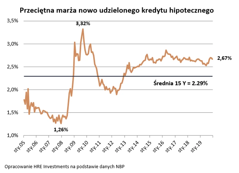 Spójrzmy więc na konkretne dane. W grudniu 2019 roku nowo udzielony kredyt mieszkaniowy był oprocentowany na 4,38%. Odejmując od tego wyniku stawkę WIBOR 3M otrzymujemy przeciętną marżę na poziomie 2,67%. To sporo, bo średnia za ostatnich 15 lat nie przekracza 2,3%, a ponadto w analizowanym czasie (180 miesięcy) znajdziemy tylko 39 miesięcy, w których kredyty były droższe niż dziś.