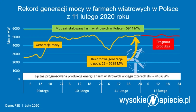 O godzinie 22 we wtorek farmy wiatrowe w Polsce pracowały ze średnią mocą 5,24 GW. Nieznacznie pobiły tym samym rekord produkcji z grudnia 2017 roku. Wiatraki zaspokoiły w ten sposób jedną czwartą zapotrzebowania na moc całej Polski – wynika ze wstępnych danych Polskich Sieci Elektroenergetycznych, przeanalizowanych przez portal WysokieNapiecie.pl.