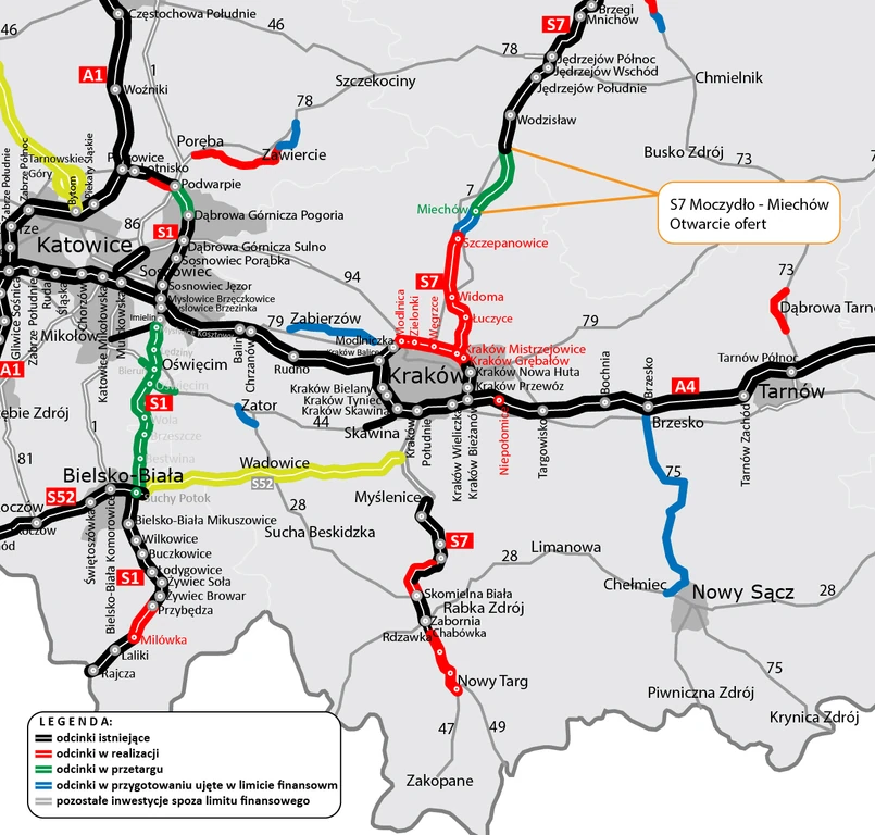 Odcinek S7 Moczydło (granica woj. świętokrzyskiego i małopolskiego) - węzeł Miechów jest częścią blisko 56-kilometrowej trasy S7, która została podzielona na krótsze odcinki realizacyjne: Miechów- Szczepanowice, węzeł Szczepanowice (z węzłem) - węzeł Widoma (z węzłem), węzeł Widoma (bez węzła) - Kraków (z włączeniem do węzła Igołomska). Ta droga ekspresowa stanowić będzie jednocześnie obwodnice dla trzech miejscowości: Książ Wielki, Miechów i Słomniki, przypomina GDDKiA.