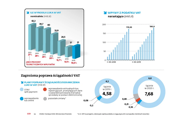 Niezależnie od tego, czy luka wzrosła, czy też „tylko” przestała spadać, dla MF może to oznaczać, że planów wyciśnięcia 4,6 mld zł z uszczelnienia VAT w 2019 r. nie udało się zrealizować. Pośrednim dowodem, że tak mogło być, jest wykonanie budżetu, w którym VAT dał 180,9 mld zł. To mniej, niż MF się spodziewało. To nie najlepsza perspektywa na ten rok, bo ministerialne plany były jeszcze śmielsze: zakładały ograniczenie luki o 7,7 mld zł.
