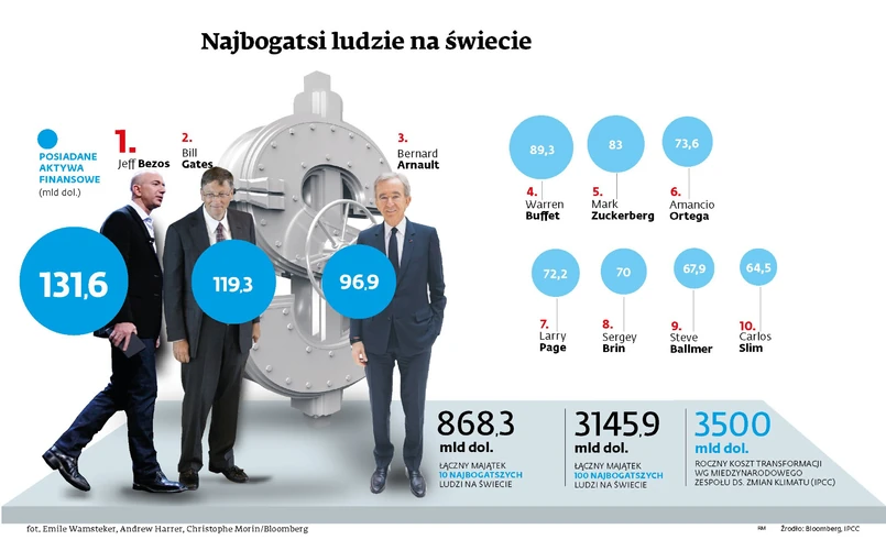 Jak obliczyliśmy, gdyby analogiczną do szefa Amazona część osobistego majątku przeznaczyło na ochronę klimatu także pozostałych czterech najbogatszych ludzi świata, powstałby fundusz o wartości 39,5 mld dol. Gdyby na walkę z kryzysem klimatycznym złożyła się w ten sposób pierwsza dziesiątka multimiliarderów, uzyskaliby kwotę 66 mld, a dwudziestka zebrałaby 106 mld. Cała setka rankingu Bloomberga po samoopodatkowaniu na wzór Bezosa byłaby w stanie uzyskać 235 mld dol.