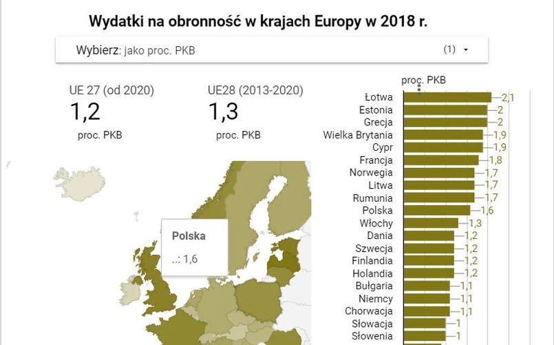 Polska w tym zestawieniu to unijny średniak. Według danych Eurostatu w 2018 r. wydatki na obronność w naszym kraju stanowiły 3,9 proc. wszystkich wydatków rządowych i były na poziomie 1,6 proc. PKB.
