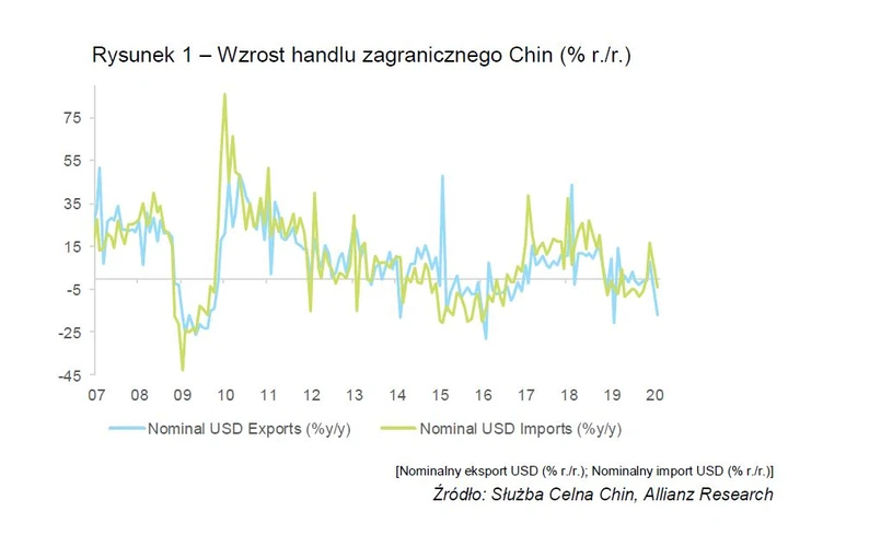 Tempo wzrostu chińskiego handlu w pierwszych dwóch miesiącach 2020 r. było najniższe od 2016 r. Spadek ten jest mimo wszystko niewielki w porównaniu z 2009 r., kiedy to eksport i import obniżyły się odpowiednio do -26,5 proc. i -43,1 proc. rok do roku w ciągu jednego miesiąca.