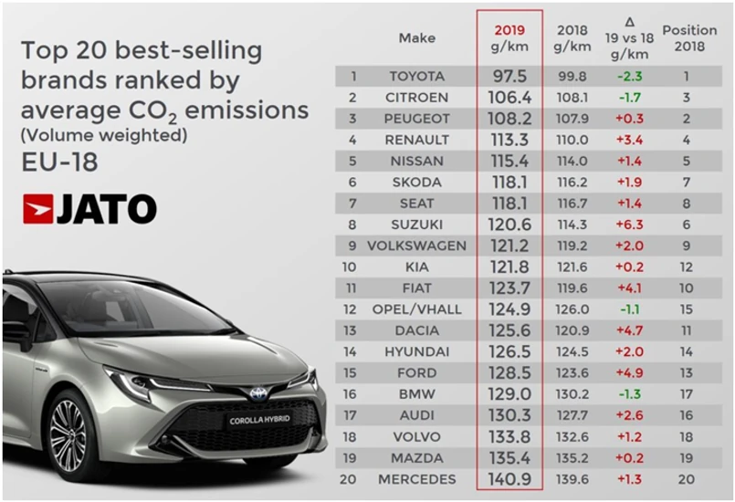 W najgorszej sytuacji są marki premium i Mazda, z kolei zdecydowanie najlepiej wypadła Toyota, która z wynikiem 97,5 g/km już w zeszłym roku była bliska spełnienia limitów. Co więcej, gdy uwzględni się reprezentującego klasę premium Lexusa to średnia emisja dla całego koncernu wzrasta do zaledwie 99 gramów (dla porównania dla całej grupy Volkswagena to 123,6 gramów). Jak to możliwe? – Europejskie koncerny mówią o elektryfikacji od lat, ale niewiele w tym kierunku robią. Japończycy przeciwnie - niewiele mówili, za to cały czas robili – komentują analitycy Jato Dynamics.