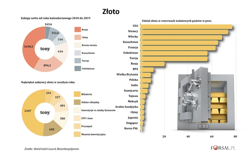 Apetyt na oficjalne kupowanie złota w ciągu ostatniej dekady pochodzi z zaskakująco małego klubu, głównie gospodarek wschodzących. Transakcje Rosji, Chin, Kazachstanu, Turcji, Uzbekistanu, Polski i Meksyku stanowiły około 90 proc. zakupów netto.