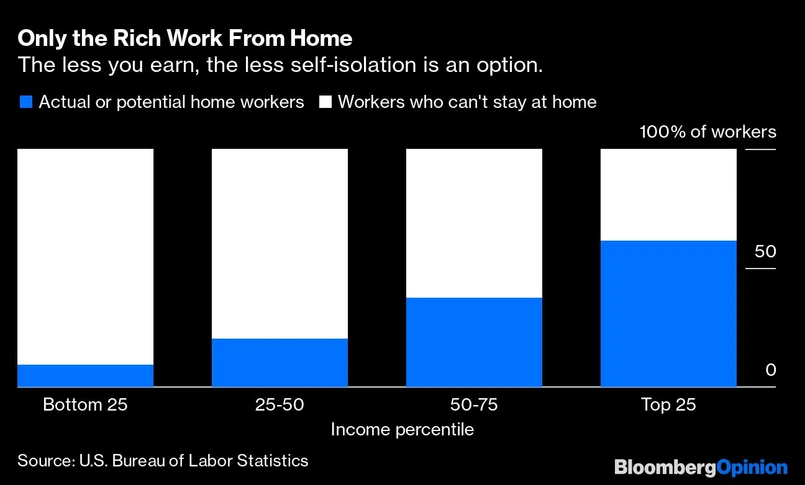 Pandemia koronawirusa jak w soczewce ujawniła nierówności – zarówno te istniejące pomiędzy różnymi krajami, jak i te objawiające się wewnątrz krajów. W USA część najbogatszych ogłosiła „samoizolację” na swoich luksusowych osiedlach lub eleganckich jachtach. Jeden z hollywoodzkich potentatów zamieścił na Instagramie zdjęcie z wartego 590 mln dol. jachtu, ale usunął je po publicznej krytyce. Ale nawet część pracowników średniego szczebla może poczuć się całkiem bezpiecznie, pracując z domu przy pomocy platform Zoom czy Slack.