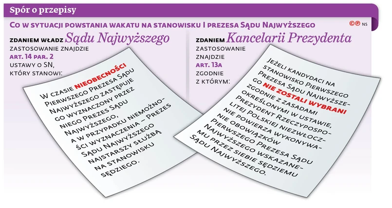 Z kolei KP uważa, że w obecnej sytuacji zastosowanie znajdzie przepis ustawy o SN mówiący o tym, że jeżeli kandydaci na I prezesa SN nie zostali wybrani zgodnie z ustawowymi wymogami, prezydent powierza obowiązki I prezesa SN dowolnie wybranemu sędziemu SN. To, że kandydaci nie zostaną wybrani zgodnie z ustawą, jest już pewne. Ta stanowi, że powinno się to stać nie później niż na sześć tygodni przed upływem kadencji I prezesa SN.