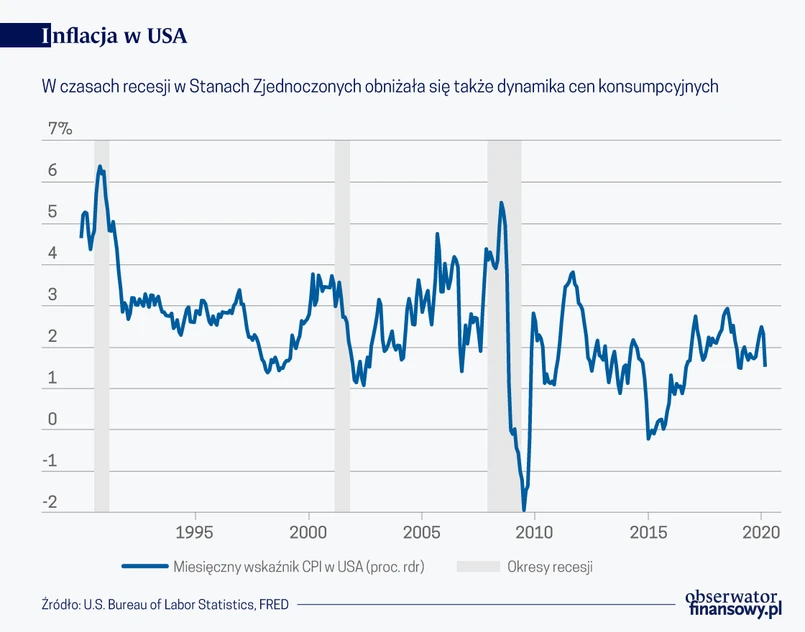 Scenariusz deflacyjny sugerowałaby również historia Wielkiej Recesji. W Stanach Zjednoczonych stopa inflacji CPI spadła z 5,5 proc. w lipcu 2008 r. do – 1,96 w lipcu 2009 r.