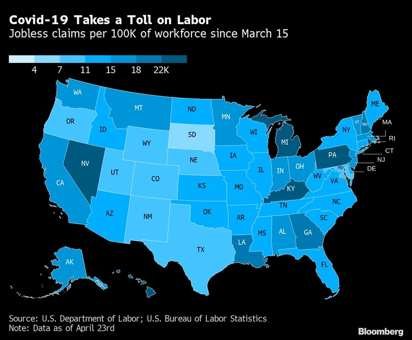 W większości stanów widoczny jest spadek liczby wpływających wniosków, co świadczy o tym, że tempo zwolnień może nieco spowalniać. Chociaż nie jest do końca jasne, w jakim stopniu dane te odzwierciedlają fakt, że miliony Amerykanów, którzy stracili pracę, nie mogą przebić się przez zablokowane strony internetowe i linie telefoniczne, aby ubiegać się o świadczenia.