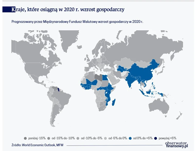 Z najnowszej prognozy ekspertów Międzynarodowego Funduszu Walutowego wynika, że światowa gospodarka skurczy się w tym roku o 3,0 proc. Recesją najsilniej dotknięte zostaną kraje najbardziej rozwinięte, w tym zwłaszcza europejskie. Według MFW recesja zmniejszy w tym roku produkt krajowy brutto krajów europejskich o 6,6 proc. (w tym krajów strefy euro o 7,5 proc.). Kryzys najsilniej może dotknąć gospodarkę Grecji (prognozowany spadek o 10,0 proc.) i Włoch (spadek o 9,1 proc.). PKB Polski – w dość pesymistycznej ocenie MFW – obniży się w 2020 r. o 4,6 proc.
