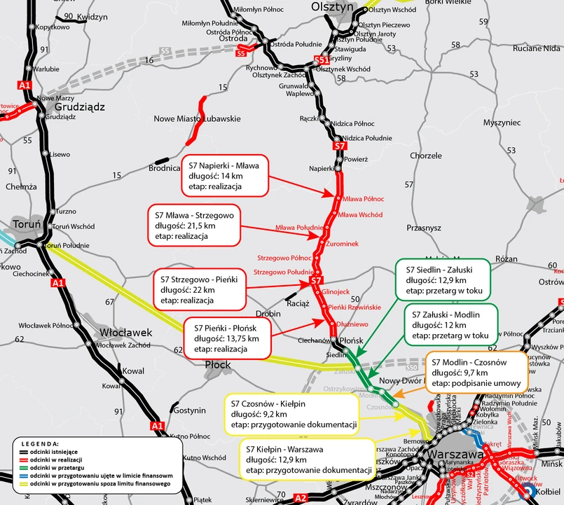 "Podpisujemy dziś umowę na odcinek S7 między Czosnowem a Modlinem. To kolejny etap inwestycji w północnej części województwa mazowieckiego. Trwają też prace na odcinkach S7 na południe od Warszawy, bo droga ta powoli uczynić bezpiecznym i przewidywalnym ruch na kierunku południkowym. Bardzo się cieszę, że epidemia nie zatrzymała, i jestem przekonany, że nie zatrzyma, polskich budów. Środki finansowe również nie zostaną wstrzymane" - powiedział minister Andrzej Adamczyk podczas wideokonferencji.