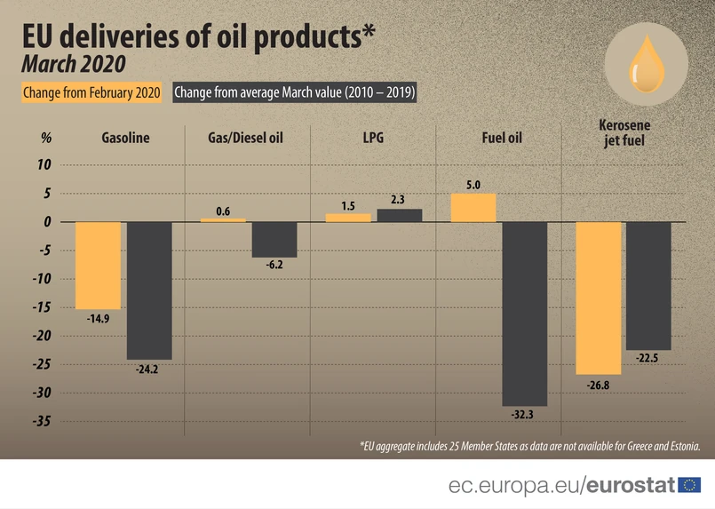 W marcu 2020 r. zużycie ropy naftowej w rafineriach w UE spadło o 5 proc. w porównaniu do lutego, a największe spadki odnotowano we Francji (-31 proc.) i we Włoszech (-24 proc.). W porównaniu ze średnią marcową wartością z ostatniej dekady zużycie rafinerii ropy spadło w tych dwóch krajach odpowiednio o 58 proc. i 33 proc..