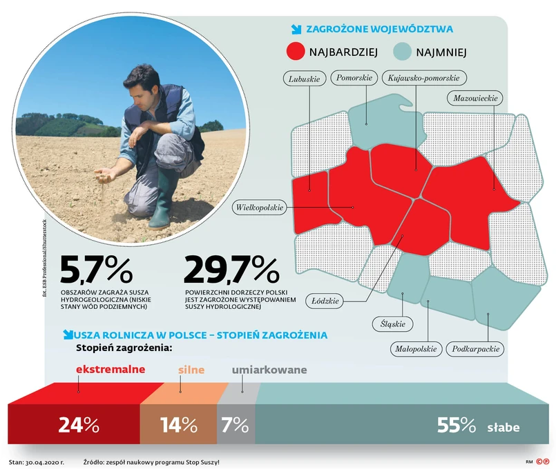 Choć na razie obyło się bez gwałtownych burz niszczących uprawy, majowe deszcze tylko nieznacznie zmniejszyły zagrożenie suszą rolniczą. – W większości województw wilgotność gleb wzrosła, ale przede wszystkim na poziomie do 7 cm. Wciąż mamy bardzo złą sytuację w lubuskim, wielkopolskim i części kujawsko-pomorskiego, bo tam opady były mniejsze i gleby wykazują brak wilgotności nawet do głębokości 1 m – wyjaśnia Sergiusz Kieruzel, rzecznik prasowy spółki Wody Polskie. W pozostałych regionach jest lepiej, jednak deszczu potrzebuje połowa kraju. Sytuacja poprawiła się zresztą tylko czasowo. Długoterminowe prognozy wskazują, że po opadach w czerwcu później znowu będzie sucho. Deszcze nie będą w stanie uzupełnić deficytu wody, który jest spowodowany bezśnieżną zimą.