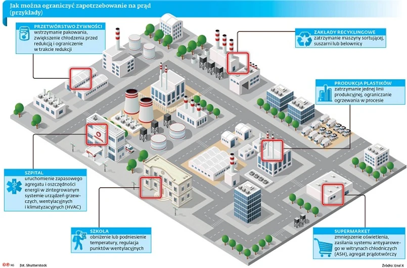 Jak inaczej przedsiębiorcy i inne podmioty mogą ograniczyć zapotrzebowanie na prąd? W przetwórstwie żywności może to być wstrzymanie pakowania, zwiększenie chłodzenia przed redukcją i ograniczenie w trakcie redukcji. W produkcji plastików – zatrzymanie jednej linii produkcyjnej, ograniczanie ogrzewania w procesie. Supermarket może zmniejszyć oświetlenie, zasilanie systemu antyparowego w witrynach chłodniczych (ASH), włączyć agregat prądotwórczy. Także szpital może uruchomić zapasowy agregat i oszczędzić energię w zintegrowanym systemie urządzeń grzewczych, wentylacyjnych i klimatyzacyjnych (HVAC). Obniżenie lub podniesienie temperatury czy regulacja punktów wentylacyjnych może być rozwiązaniem dla szkoły. Zakłady recyklingowe mogą zatrzymać maszynę sortującą, suszarnię lub belownicę.
