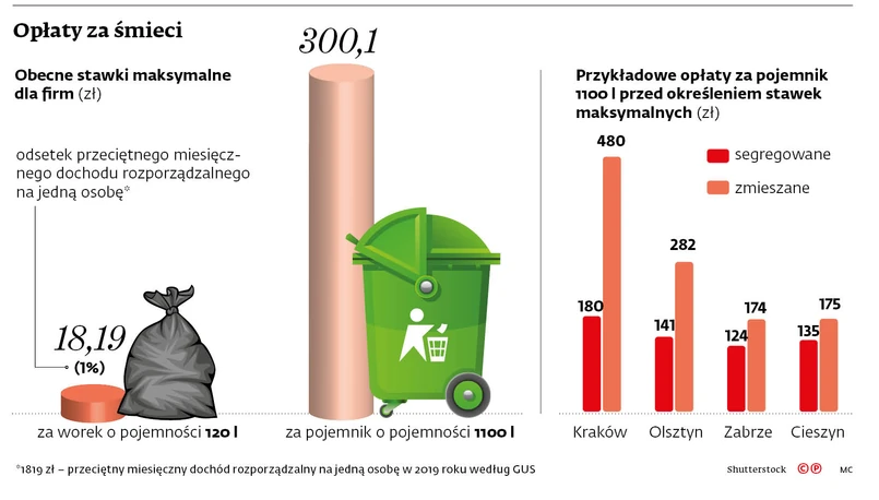 Odpowiadałyby to realiom rynku. Zanim zaczęły obowiązywać maksymalne stawki za śmieci określone w lipcowej nowelizacji, przykładowo w Olsztynie za pojemnik 1100 litrów zmieszanych odpadów firma musiała zapłacić gminie 282 zł (za pojemnik posegregowanych śmieci – 141 zł), w Krakowie było to 480 zł (za odpady zmieszane) i 180 zł (za posegregowane) (więcej – patrz infografika).